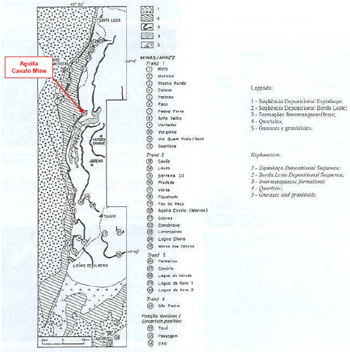5 – The manganese in the region is a result of the supergenic enrichment of metavolcano-sedimentary rocks from the Late Archean represented by the Licínio de Almeida Complex. There is no relation with the rocks from the Santo Onofre Group incthe Espinhaço Sequence.