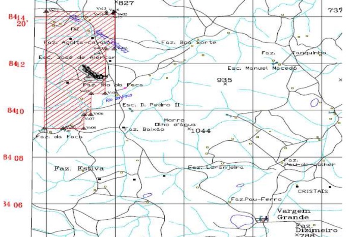 The Açoita Cavalo mine presents a target area estimated in 42.0 ha, bearing NW/SE within the coordinates (UTM) 8411900 / 0770900; 8411900 / 0771300; 8411300 / 0770900 e 8411300 / 0771900. It is contained in the east portion of the research area registered in the DNPM under the number 870756/2005 (Fig. 1). It comprehends 840.0 ha and is located in the manganese bearing district of Urandi / Licinio de Almeida, in the Bahia State (Photos 1 – to 6).
